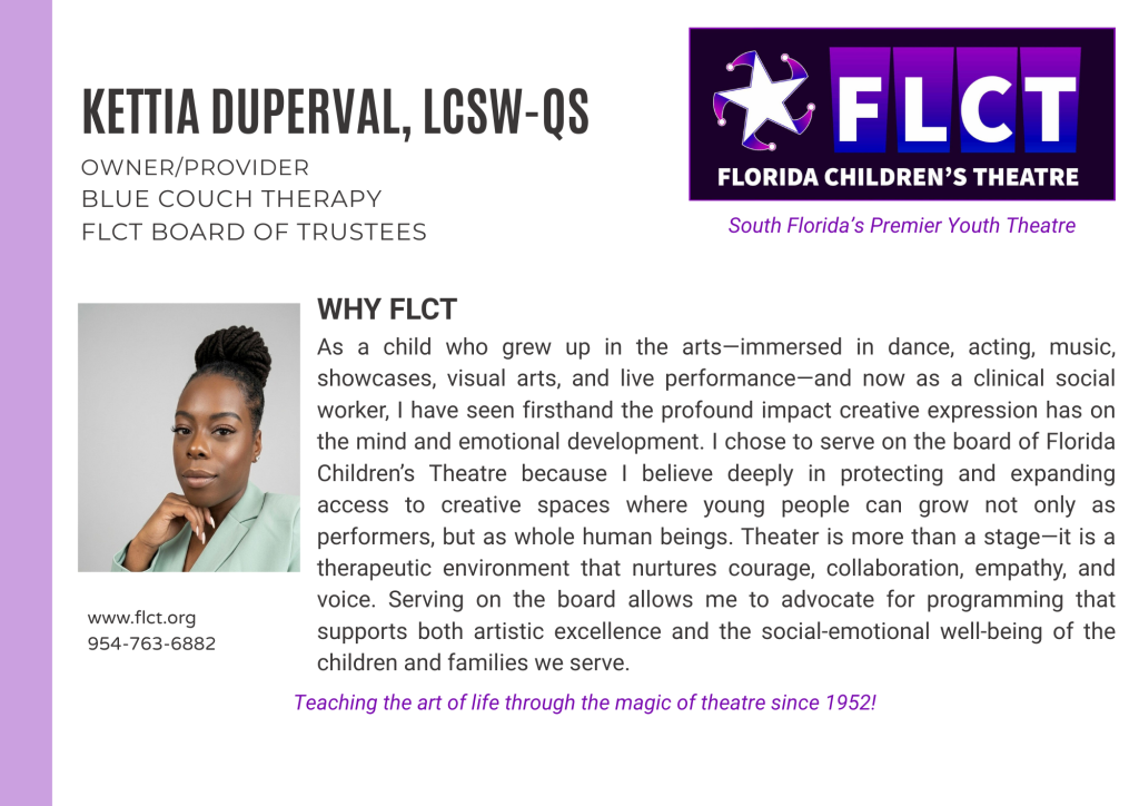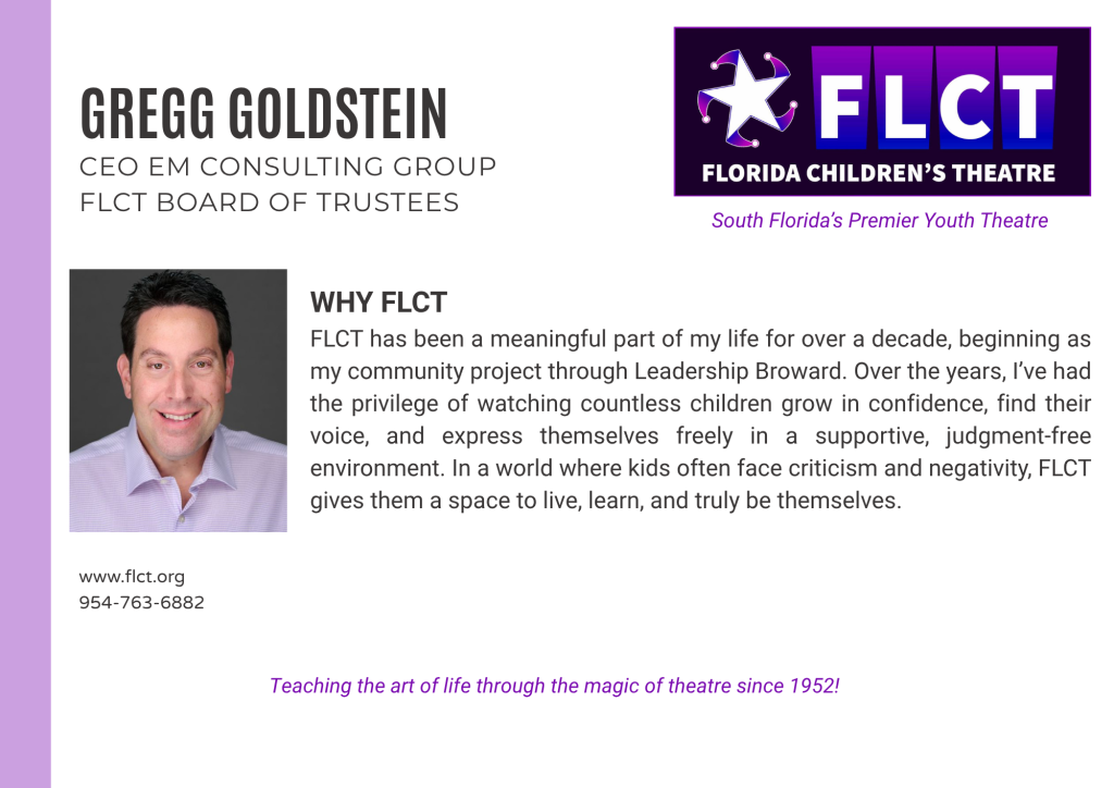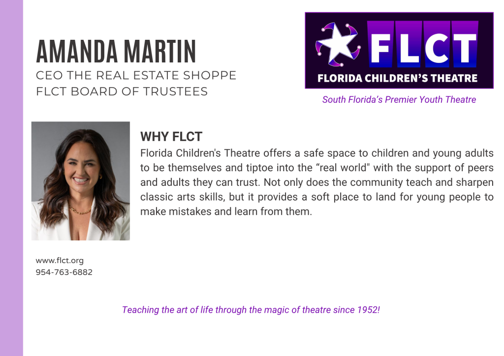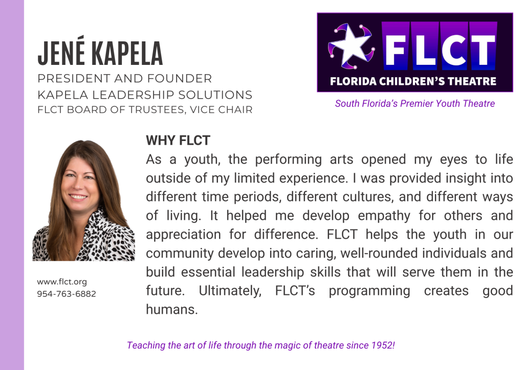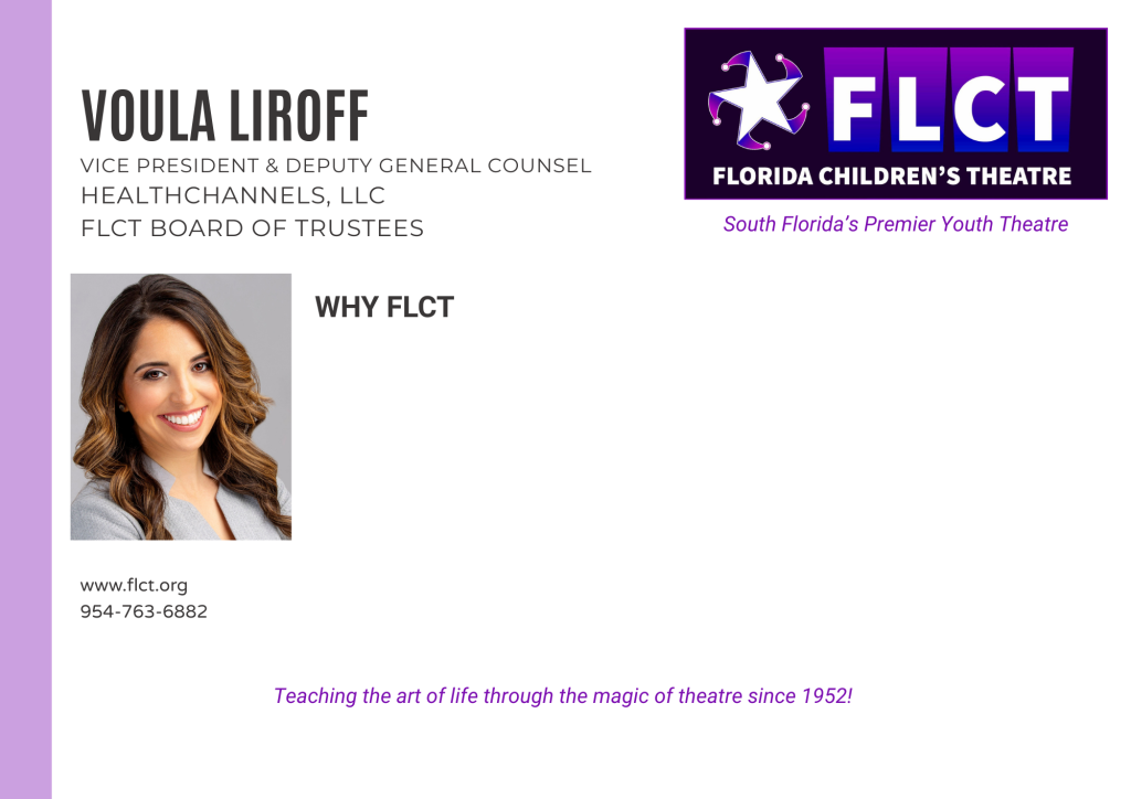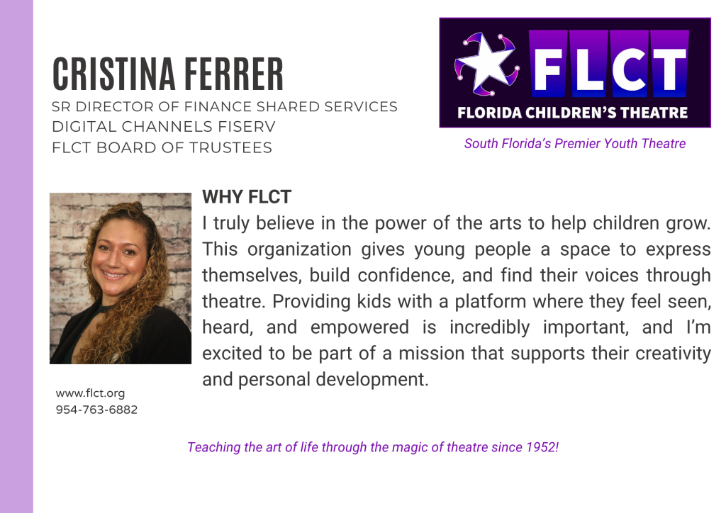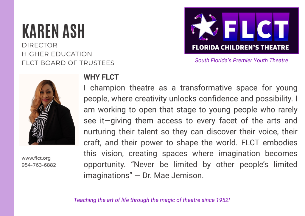 Florida Children’s Theatre (formerly Fort Lauderdale Children’s Theatre) is a not–for-profit, 501(c)(3) educational center for the theatre arts founded in 1952 for the purpose of providing arts and education programs to youth and adults. The control and management of the organization are vested in the Board of Trustees, a policy making and planning body with supervision over the affairs of the corporation. Trustees support the organization’s mission, purposes, goals, policies and programs through governance, fiduciary oversight, financial contribution, fund-raising, strategic planning, expertise, and service. Membership is by invitation and vote.