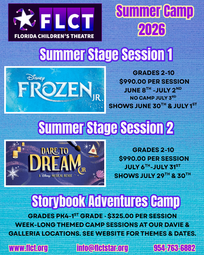 Get ready for a summer of excitement, creativity, and performance at FLCT’s Summer Stage Theatre Camp! Campers will dive into the world of theatre through two four-week sessions, each culminating in a full-scale musical production. From learning the audition process to honing skills in acting, singing, and dancing, this camp is the perfect place for young performers to shine!